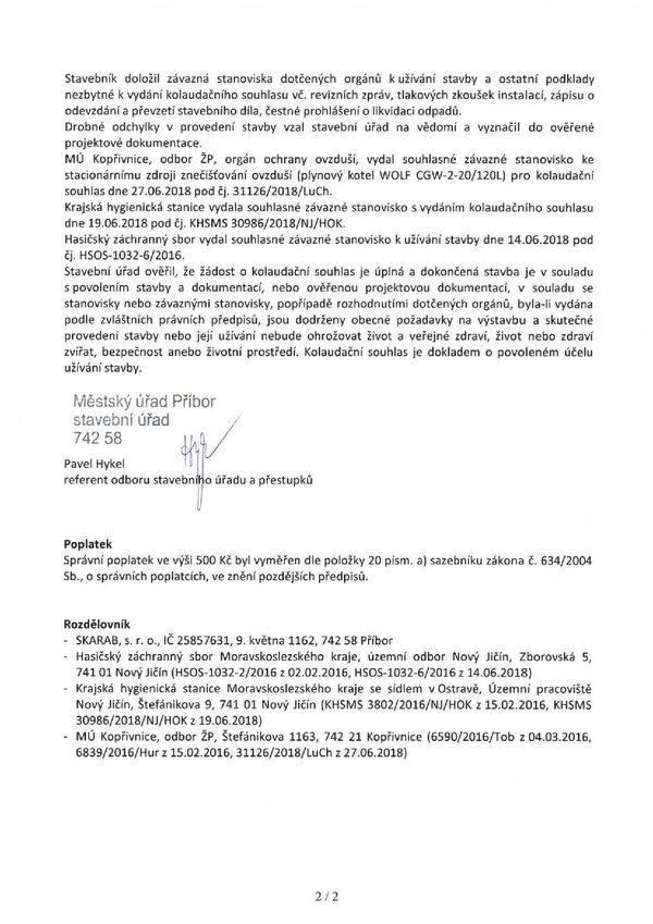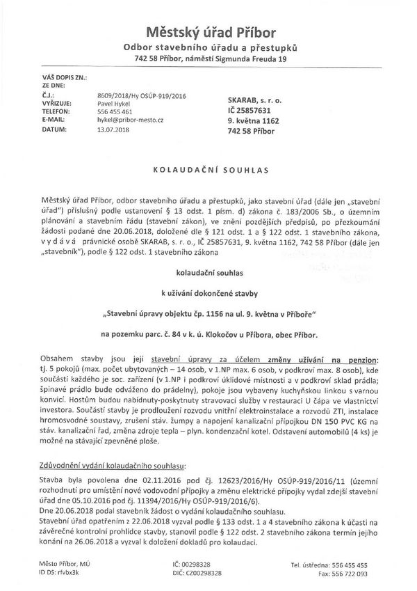 Před oficiálním otevřením jsme prošli dlouhým procesem. Završením tohoto procesu a dokladem pro nás nejcennějším je Kolaudační rozhodnutí. A tak se s Vámi dělíme o tuto naši radost a zároveň oficiálně dokládáme, že jsme z kdysi obytné vilky, následně na dlouhý čas přeměněné na sídlo vedení firmy Skarab, s.r.o. (familiérně jsme to zde měli pojmenováno jako HRAD) prošli procesem přeměny těchto prostor na útulný rodinný penzion.